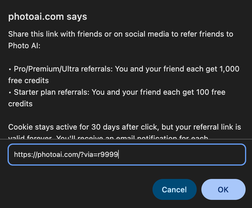 The referral cookie once they click the link will remain for 30 days. So if they don’t sign up immediately but if they ever come back to Photo AI and sign up later, it is still counted!
