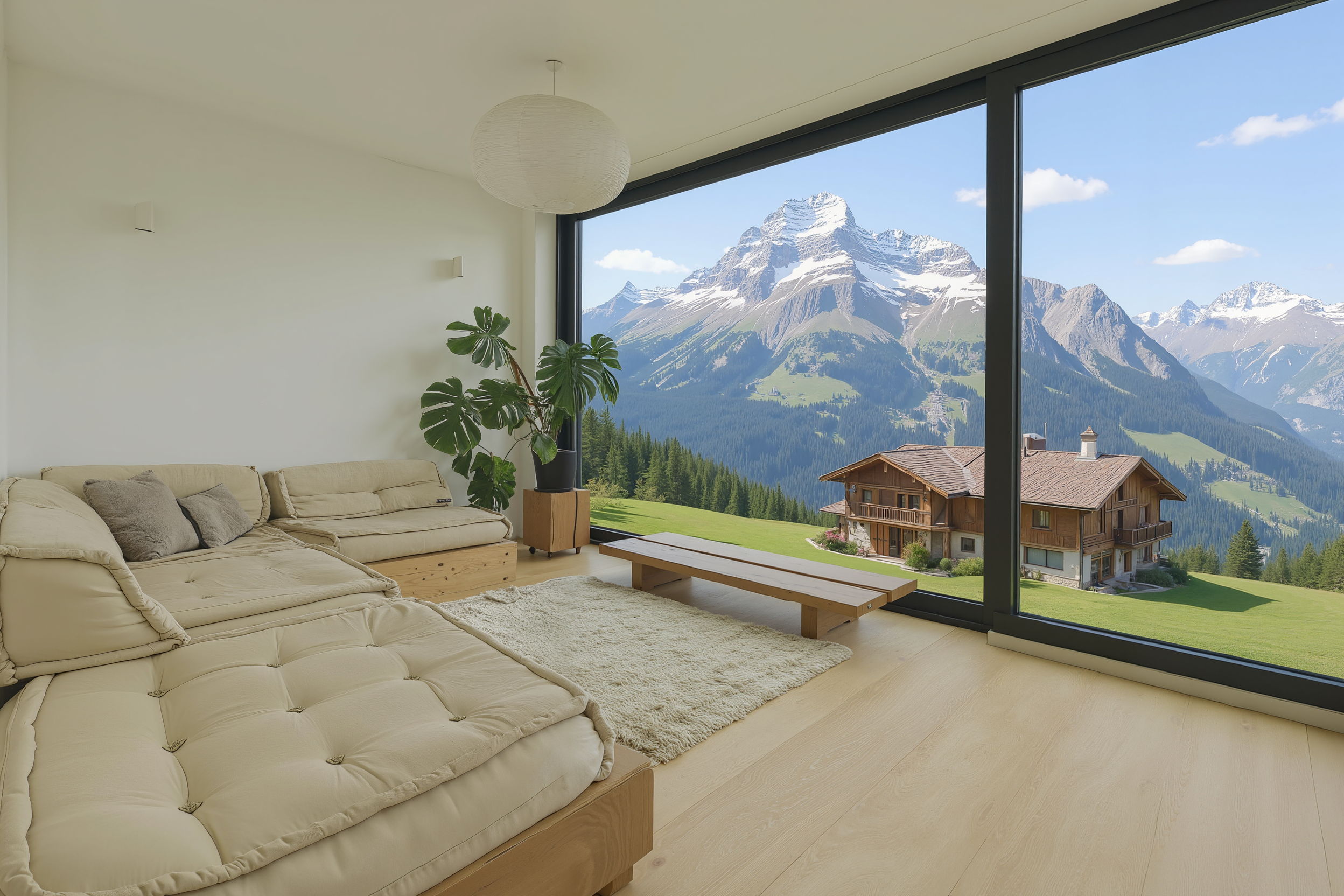 "Change the window view to a chalet in the Swiss alps"
