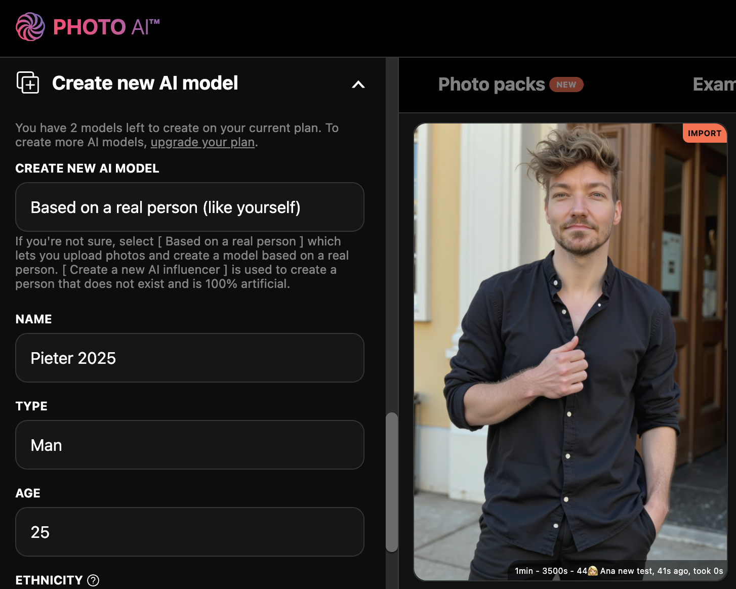 You can generate more at any time by writing your own prompt or running a photo pack — pre-made styles with curated lighting, outfits, and backgrounds: