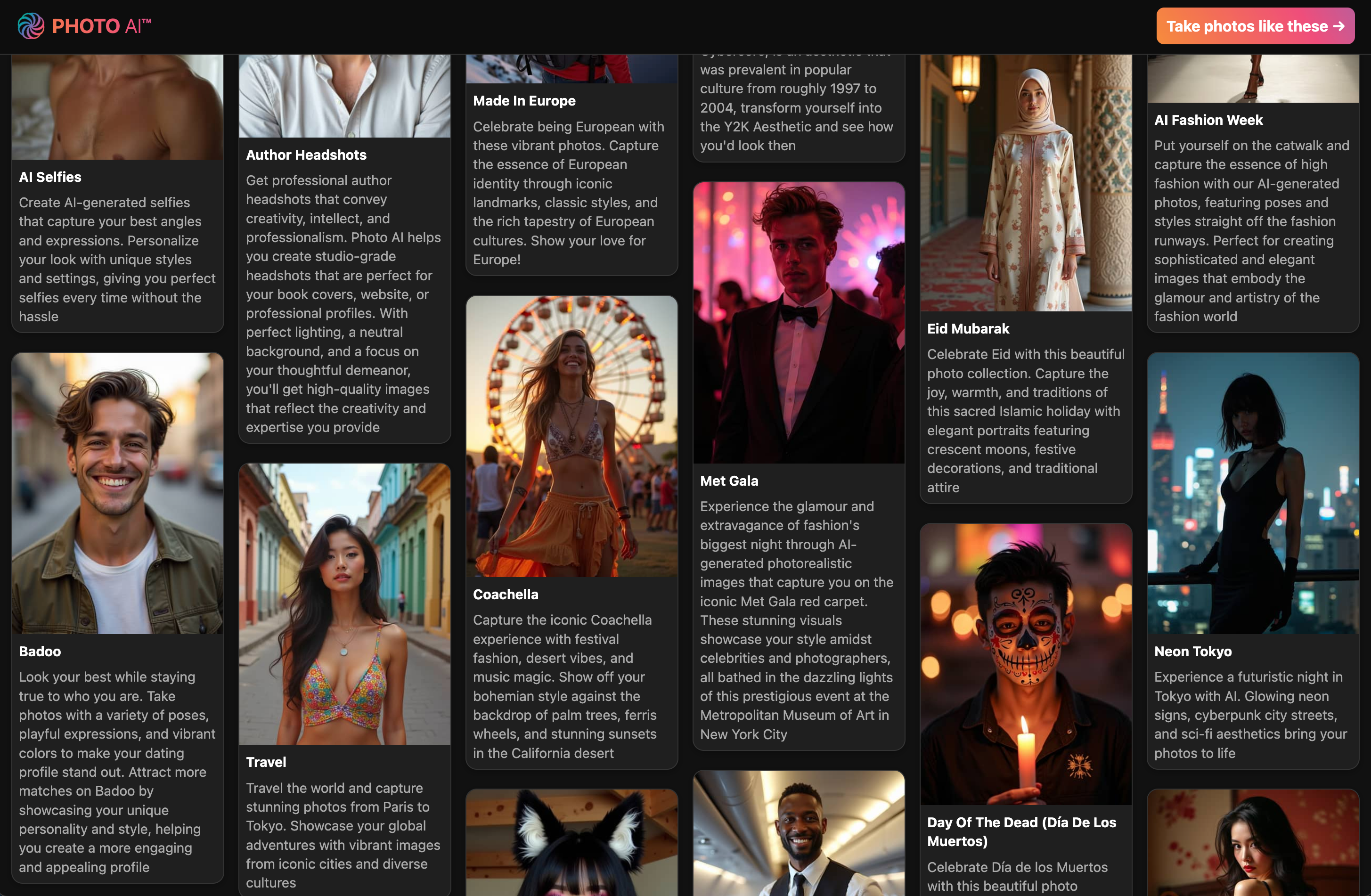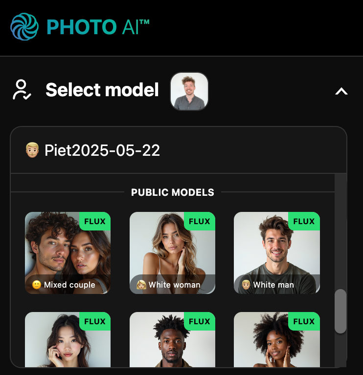 Every model on Photo AI comes with dozens of AI-generated photos automatically, including: