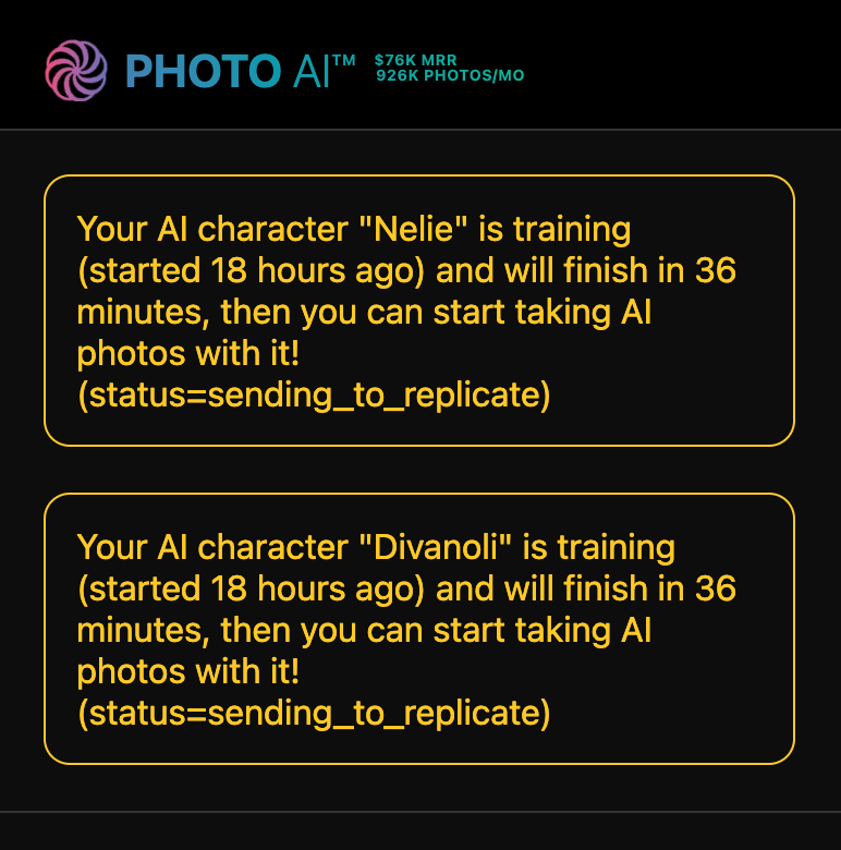 Your AI character "Divanoli" is training (started 18 hours ago) and will finish in 36 minutes, then you can start taking AI photos with it! (status=sendingtoreplicate)