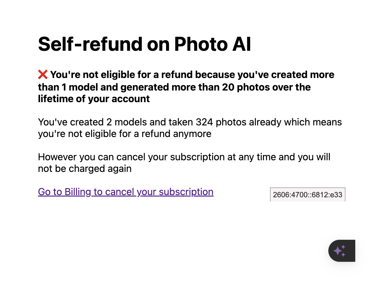 I cant use the self refund page. It says I have 1 model but that model I created on the first month of my subscription. I only wanted to use photoai 1 month, as soon as I got the renewal charge (yesterday) I asked for a refund. I havent used any of the credits or models for this month I should get a refund but cant because the logic is faulty