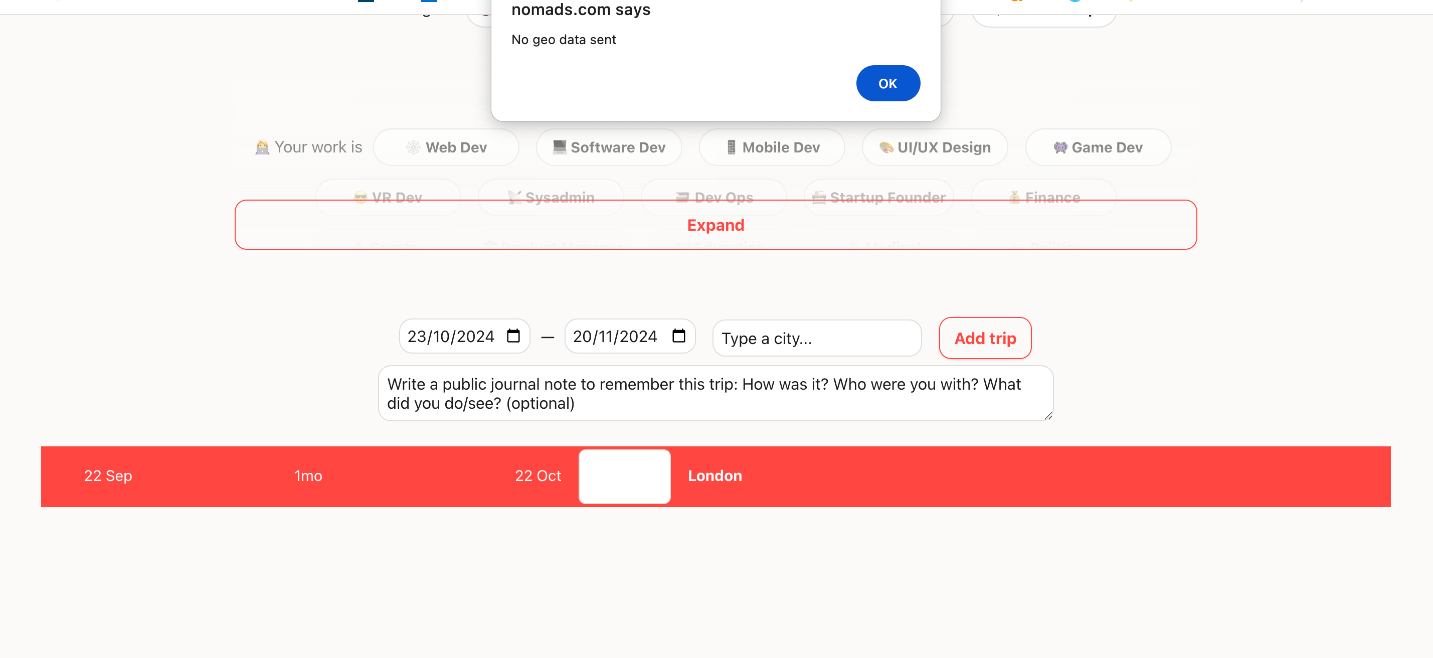 If i enter the dates and the city, then click add trip first I get an browser message "trip lattitude empty" then "no geo data sent" and nothing happens.